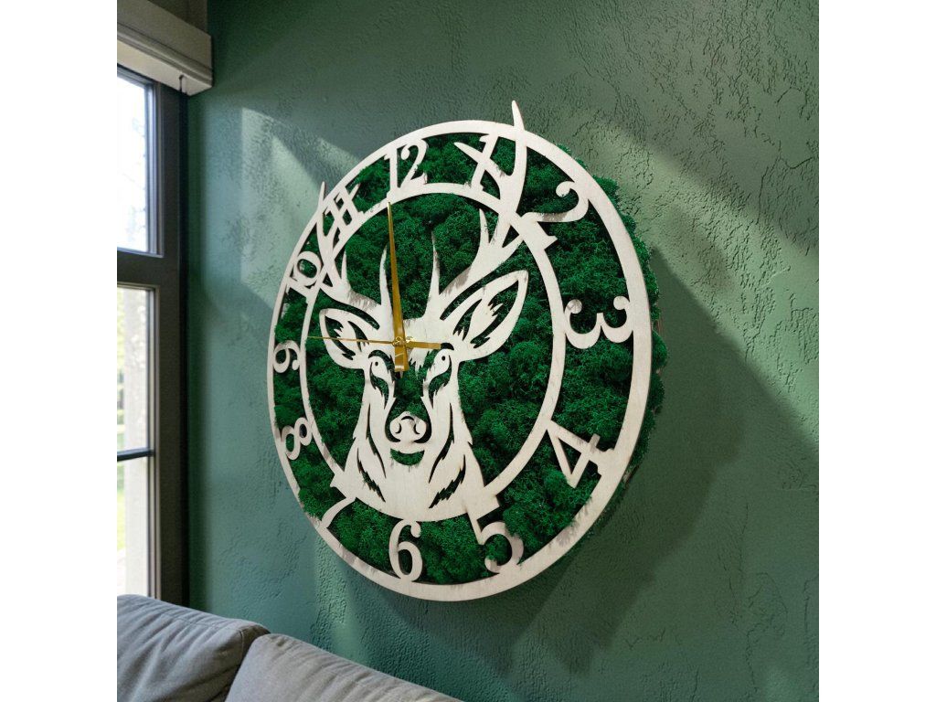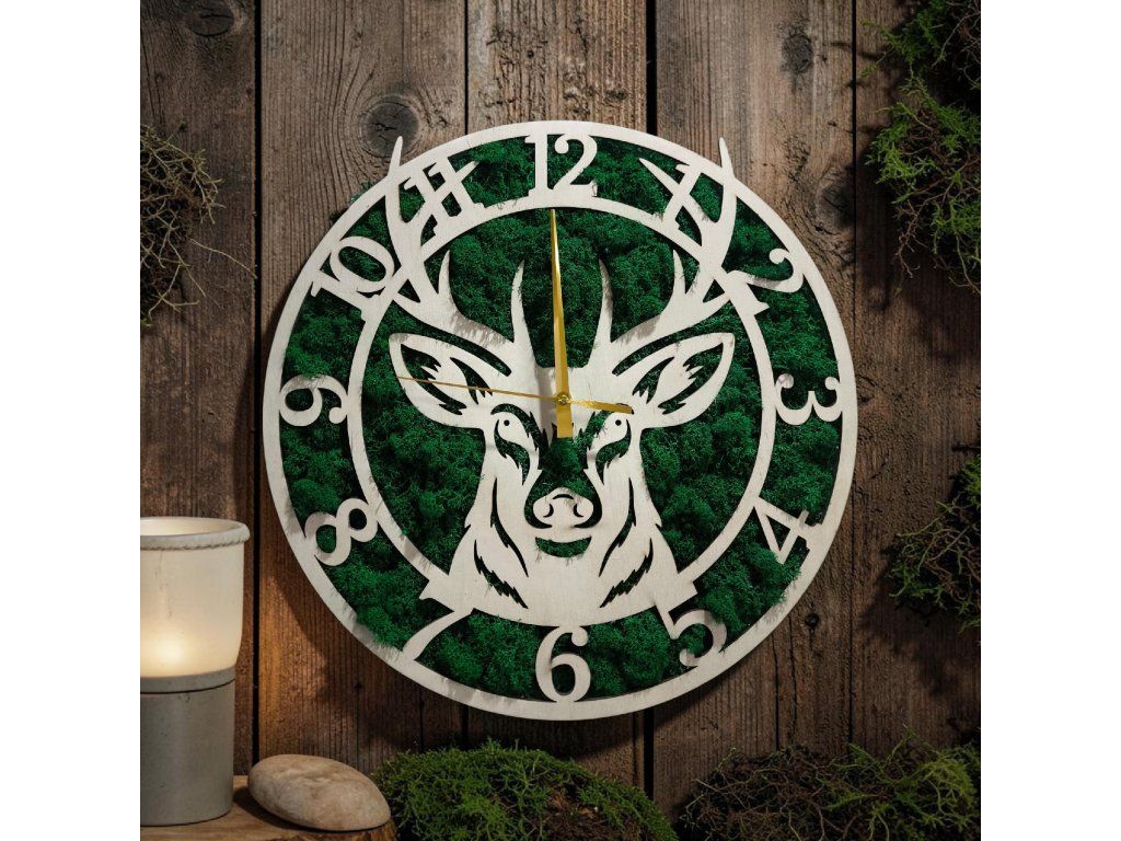 Vneste do svojho domova kúsok živej prírody a lesného pokoja. Naše ručne vyrábané nástenné hodiny kombinujú precízne spracované drevo s moderným fenoménom v interiéri – stabilizovaným nórskym machom. Dominantný motív kráľa lesa z nich robí nielen praktický ukazovateľ času, ale predovšetkým dychberúce umelecké dielo.