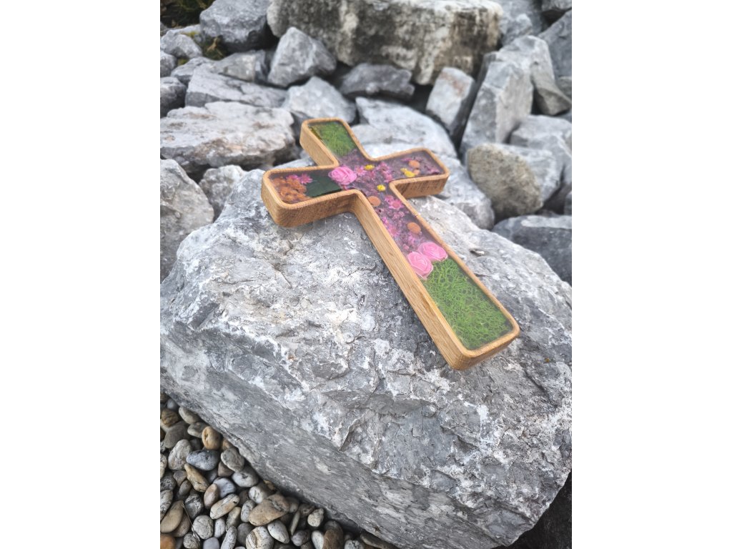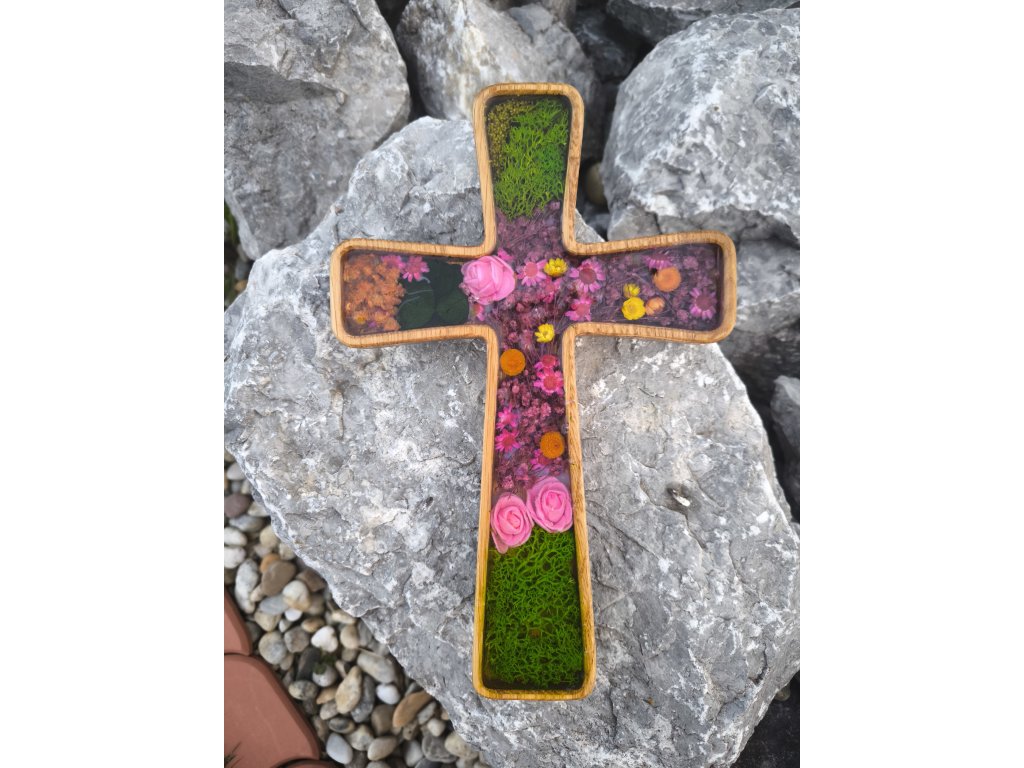 Drevený krížik s epoxidom a stabilizovanými kvetmi a machom