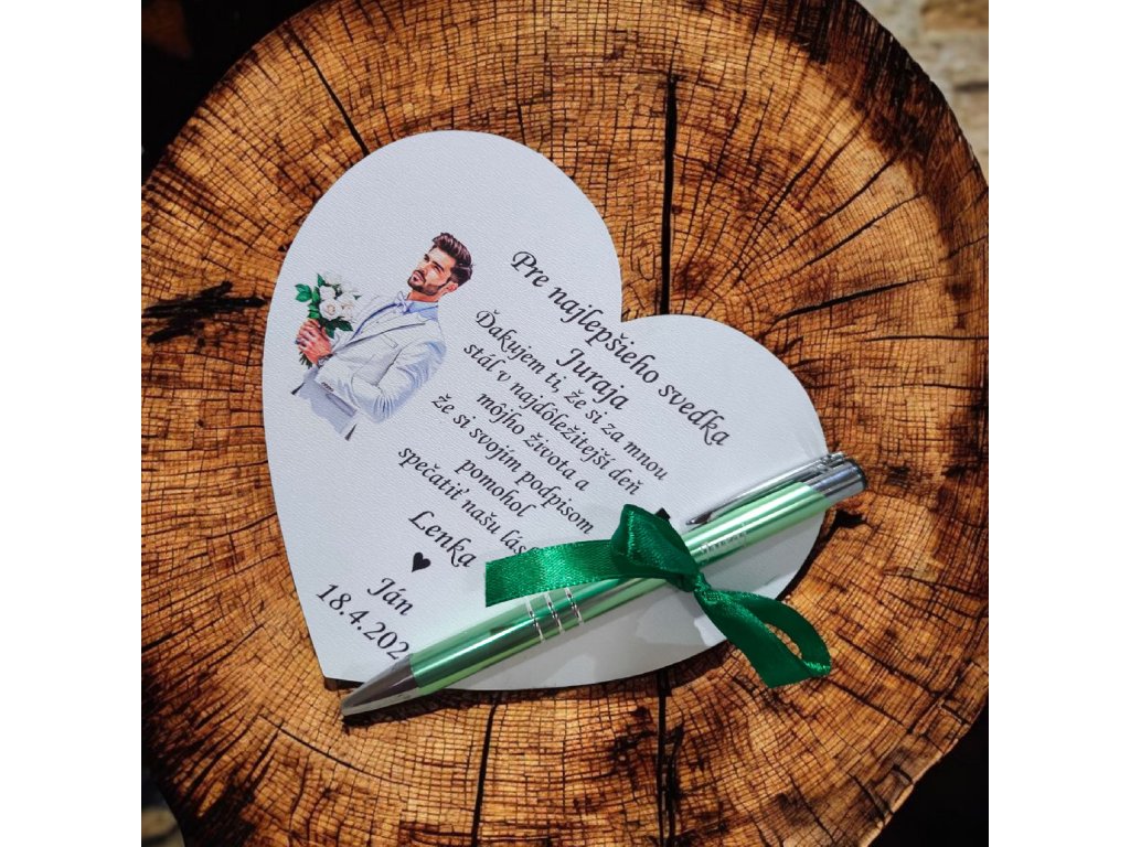 Svadobné poďakovanie pre svedka so srdcom a gravírovaným perom