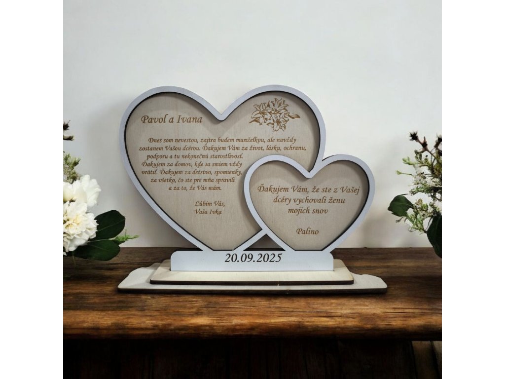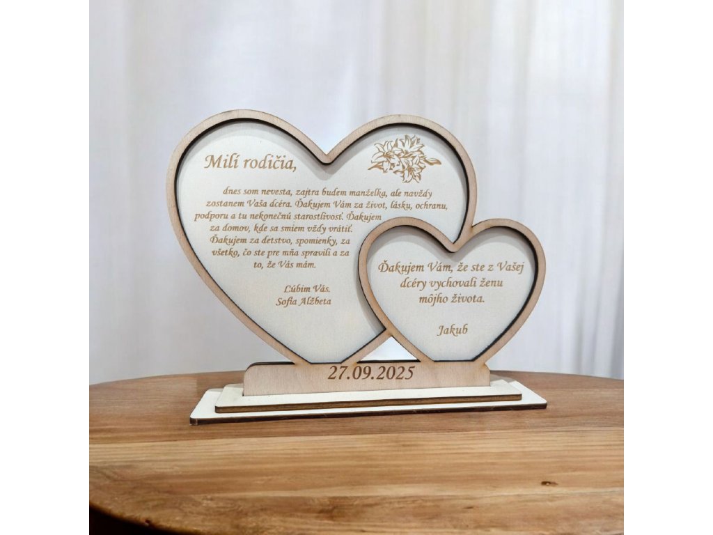 Drevené poďakovanie pre rodičov v bielom alebo v klasickom drevenom prevedení. Text vieme pozmeniť podľa požiadaviek . Je to skvelý darček pre rodičov ktorý symbolizuje vašu lásku a vďaku k rodičom. Poďakovanie vieme vyrobiť aj pre babku , dedka, tetu, uja, súrodencov ...