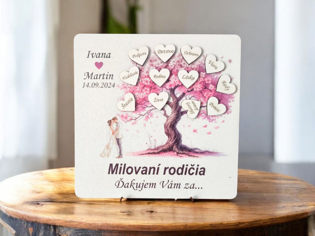 Drevené poďakovanie pre rodičov tabuľka na podstavci. Veľmi pekne poďakovanie ktoré rodičom vyčarí úsmev na tvári a bude pre nich peknou spomienkou. Nápis na srdiečkach viem pozmeniť podľa vašich požiadaviek.