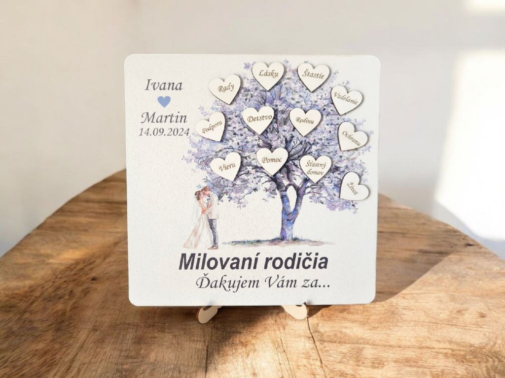 Drevené poďakovanie pre rodičov tabuľka na podstavci. Veľmi pekne poďakovanie ktoré rodičom vyčarí úsmev na tvári a bude pre nich peknou spomienkou. Nápis na srdiečkach viem pozmeniť podľa vašich požiadaviek.